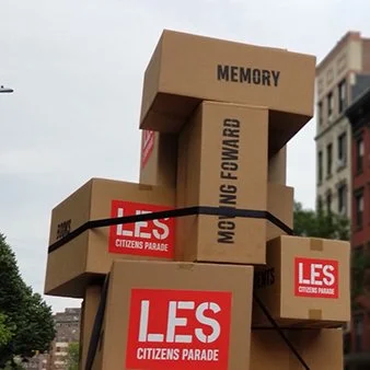 At the LES Citizens Parade, senior citizens of Chinese, Hispanic, and Jewish descent pretend to be a moving company, surrounded by cardboard boxes that carry immigrant stories. PDF
