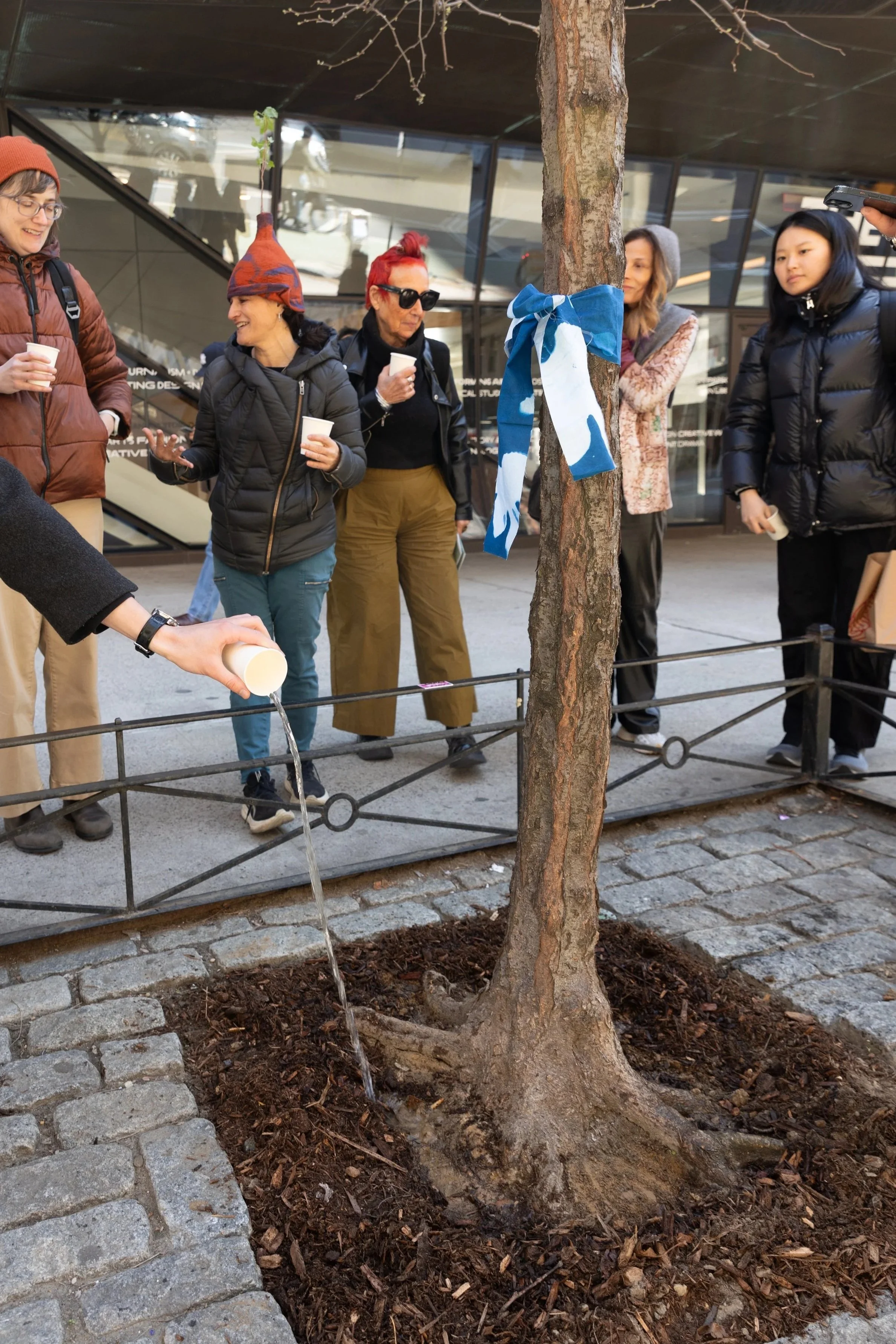 System — exchanging greetings with our new arboreal acquaintances through sound as an emotive and gestural, rather than semiotic, tool. We noticed the trees by identifying them on the NYC Tree Map, rubbing bark, and smelling. We cared for the trees by picking up trash, aerating soil, and spreading mulch in a doughnut at the base. We departed with a toast to the tree, shared a sip of water, and tied ribbons and wishes to the tree.