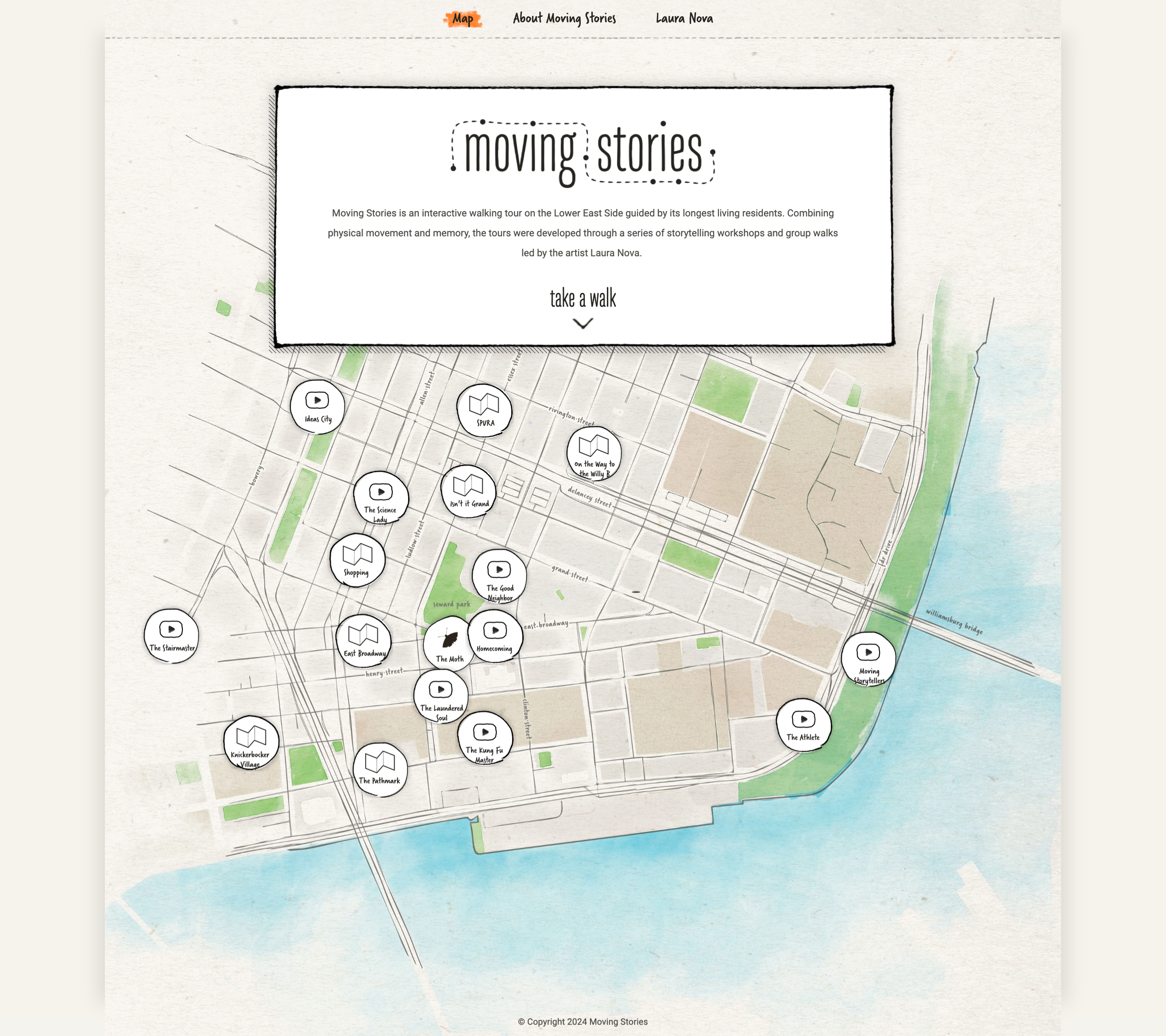 Moving Stories is an interactive walking tour on the Lower East Side that encourages senior citizens to combine physical movement and memory developed through a series of storytelling workshops and group walks.