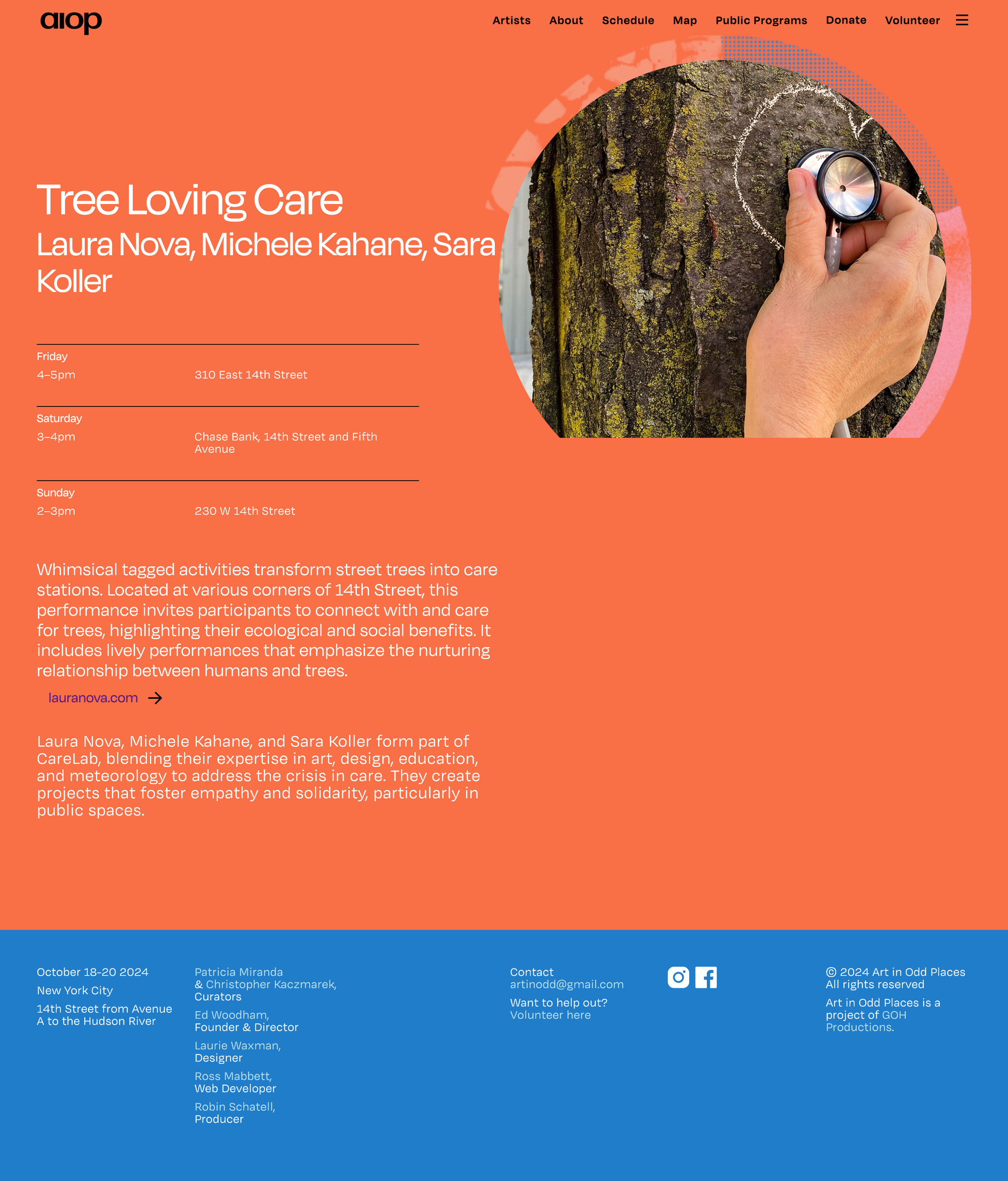 TLC transforms street trees into care stations. Located at various corners of 14th Street, this performance invites participants to connect with and care for trees, highlighting their ecological and social benefits. It includes lively performances that emphasize the nurturing relationship between humans and trees.